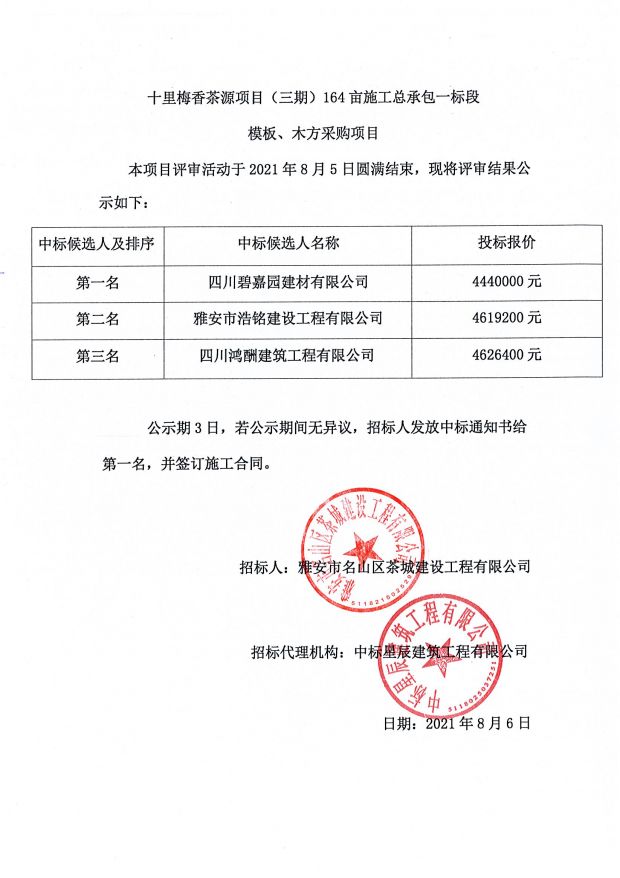 十里梅香茶源小鎮(三期)164畝施工總承包一標段模板、木方采購中標公示